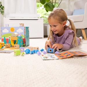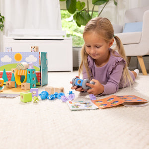 Kids can easily expand their collection -- the 73-piece Town Play Set is compatible with all other Blockables™ play sets. The packaging folds out to convert into a fun play space and pieces store in the sturdy corrugated box with a soft handle for easy cleanup and portability. Patent pending.