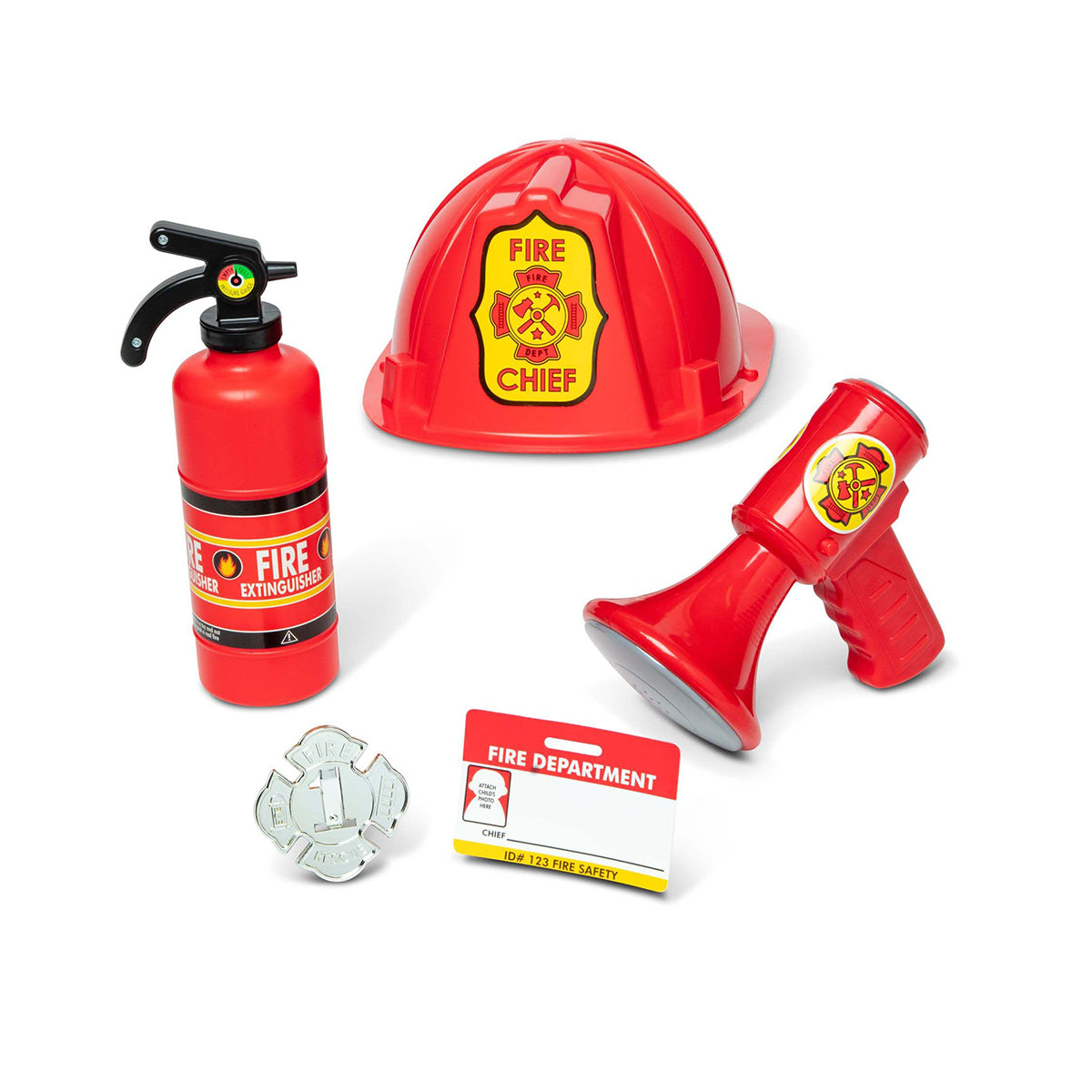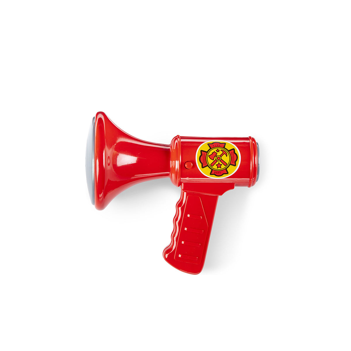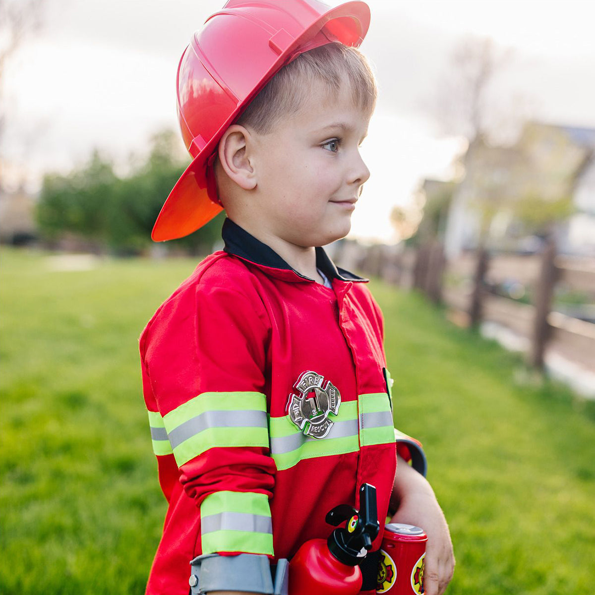 Sound the sirens and make way for the rescue! This role play outfit has everything an aspiring firefighter needs in an emergency: a bright red jacket trimmed with reflective material, a fire chief helmet, a "fire extinguisher," a bullhorn with sound effects, a shiny badge, and a name tag so kids can personalize their outfit.