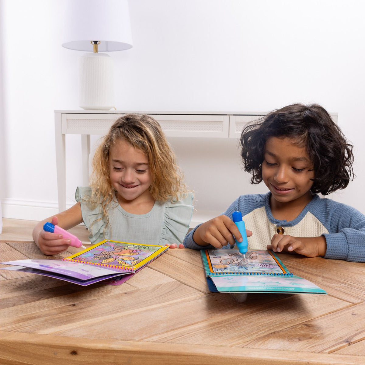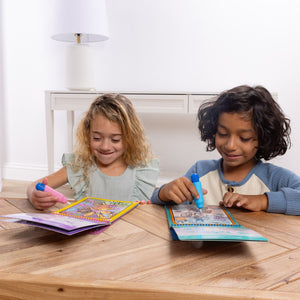 No-mess painting for kids! This exciting paint-with-water coloring book includes four reusable pages and a refillable water pen. Simply use the pen to color in each scene—details and vibrant color appear with every stroke!