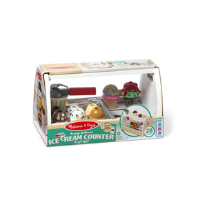 Kids can scoop up some cool treats with this all-inclusive, 28-piece pretend play ice cream counter! The sturdy wooden tabletop counter holds eight wooden scoops of different-flavored ice cream, six assorted toppings, two cones, a plastic cup, an ice cream scooper, a wooden spoon, tongs, reusable menu card, and six pretend dollar bills.