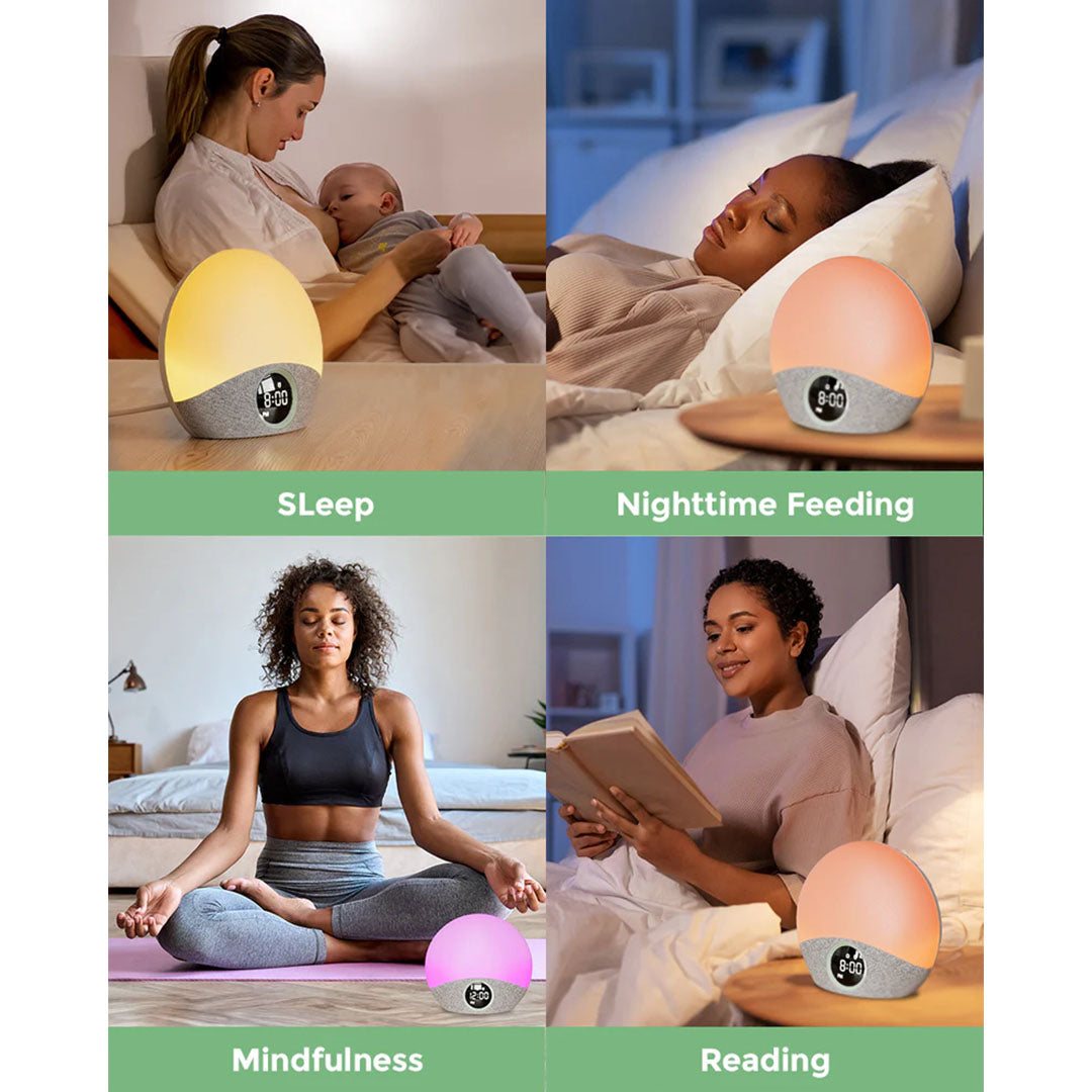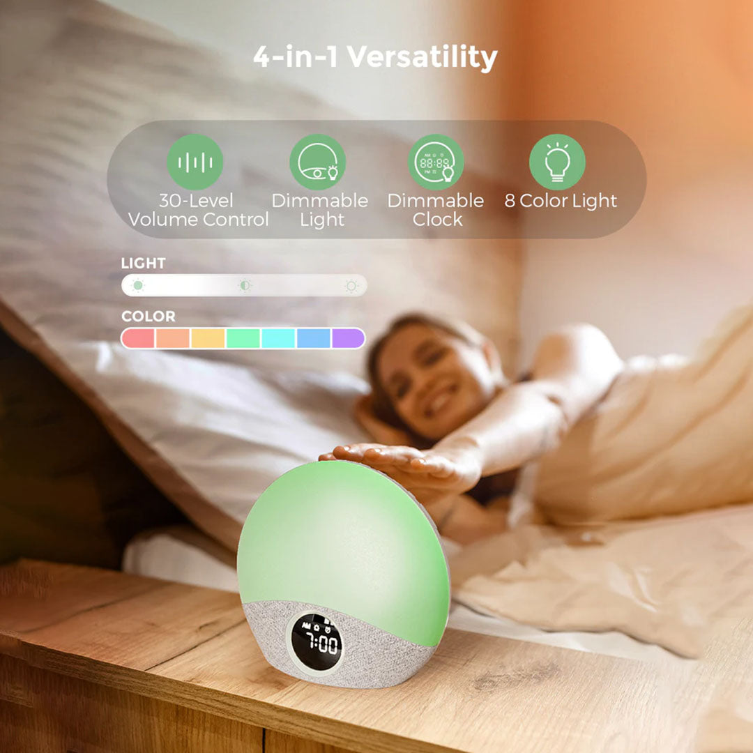 Resembling the ascending sun on the horizon, the Momcozy Sunrise sound machine gently rouses you with a mellow yellow light akin to the morning sun, accompanied by soothing melodies for a tranquil wake-up experience. Start a new day with the beautiful sunrise alarm!