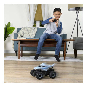 From the depths of the prehistoric ocean rises the all-new, official Monster Jam 1:24 scale Megalodon RC! This powerful predator lashes about to perform epic stunts, crazy crashes and brutal bashes! Featuring 2.4 GHz, you can race up to 6 Monster Jam trucks at a time! Now it’s even easier to host your own high-flying Monster Jam rally with your friends! And with a range of up to 250 ft., this prehistoric shark can travel farther in search of puny prey to pulverize! Nothing will stop it from dominating the Monster Jam circuit! Authentically styled, this 1:24 scale Megalodon remote control comes with official BKT Tires and a look-alike chassis, making sure this giant shark always delivers big fun! The all-new Megalodon RC is like driving the real thing! Catch this prehistoric beast and perform high-flying, gravity defying stunts like big air, donuts, cyclones and more! You’ve never been this close to the Monster Jam action than with the all-new, official Monster Jam 1:24 scale Megalodon RC!