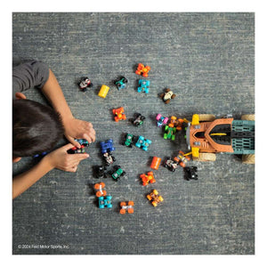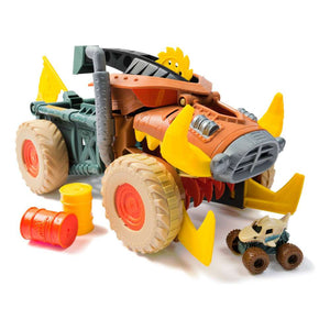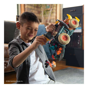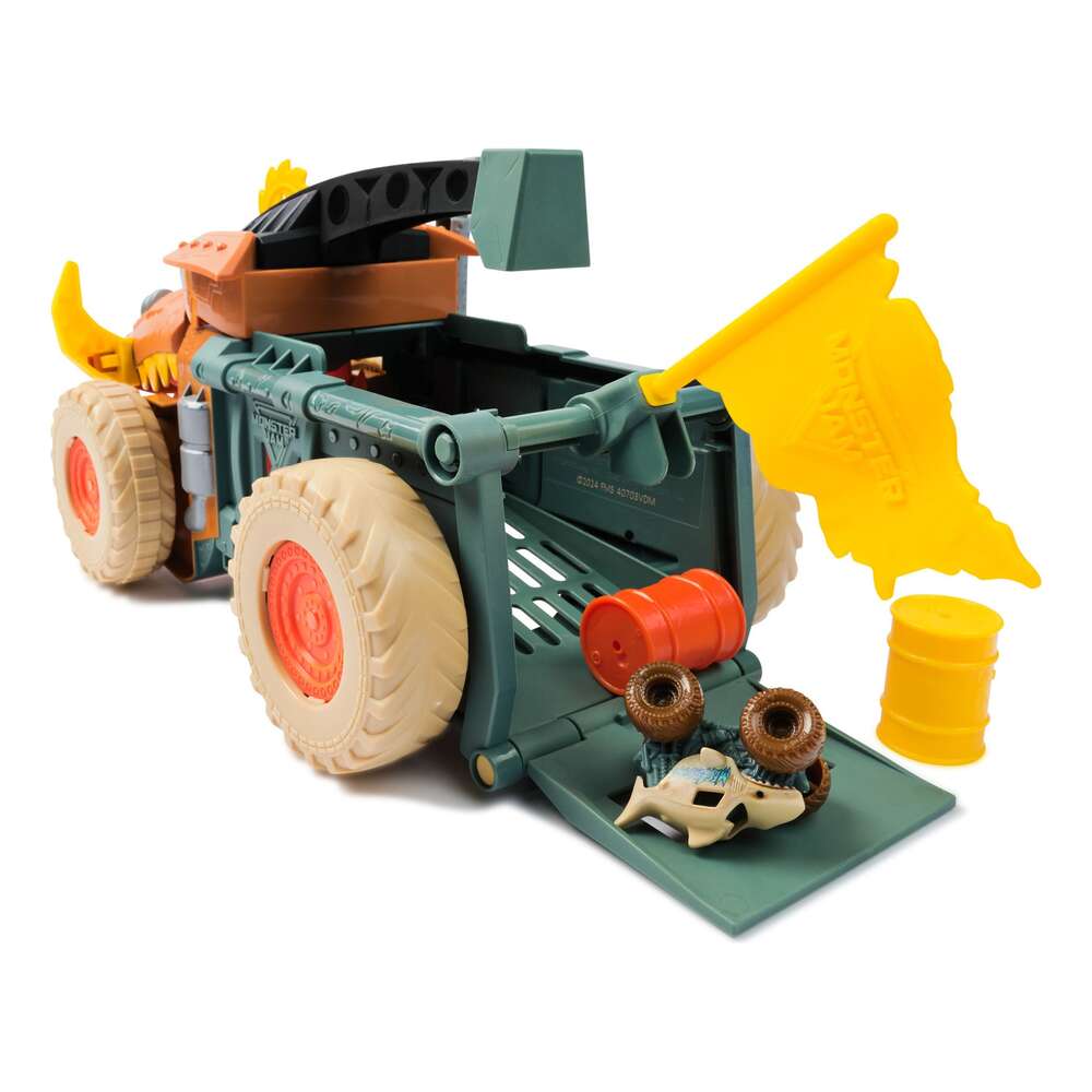 Unleash the Monster Jam madness with the Monster Jam Mini Jams Megalodon Mad Hog Chomper. Designed for young fans aged 3 and up, this playset brings a thrilling twist to both playtime and cleanup. Featuring an epic Mad Hog Chomper, Megalodon truck in 1:87 scale and 2 barrels. Use the epic Mad Hog Chomper to chomp up your Mini Jams Monster Jam trucks for easy storage. This not only keeps the living room tidy but also makes cleanup an exciting part of the game. Each launch and chomp introduces kids to cause and effect while fostering fine motor skills through active play. Fully compatible with all 1:87 scale Mini Jams trucks, the possibilities for creative play are limitless. Gift the Megalodon Mad Hog Chomper to the young Monster Jam fan in your life and watch them delight in the fun of scooping up their monster trucks time and again, making this Monster Jam playset a favourite for both play and putting away.