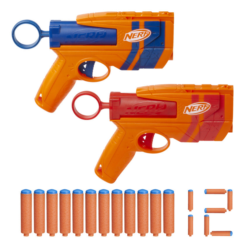 NERF and HASBRO and all related trademarks and logos are trademarks of Hasbro, Inc. Includes: 2 blasters and 12 darts. Ages 8 and up TO AVOID EYE INJURY: WARNING: Do not aim at eyes or face. Use of eyewear recommended for players and people within range. Use only official Nerf darts. Other darts may not meet safety standards. Do not modify darts or blaster.