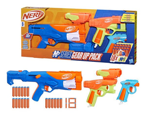 EXTREME ACCURACY, SPEED, and DISTANCE! The Nerf N Series Gear Up Pack includes 3 different blasters and 2 Nerf accessories to create 10 different blaster styles. Build your Nerf stockpile and be ready for whatever the game brings with this set that includes 18 Nerf N1 foam darts. The Flex blaster and Dealer blaster are single-fire blasters with pull-down priming. The bolt action Wielder blaster fires 4 darts in a row. The stock attaches to 2 of the blasters. The scope attaches to all 3 blasters. Nerf N Series blasters are compatible only with Nerf N Series N1 darts. Eyewear recommended (not included). Ages 8 and up TO AVOID EYE INJURY: WARNING: Do not aim at eyes or face. Use of eyewear recommended for players and people within range. Use only official Nerf darts. Other darts may not meet safety standards. Do not modify darts or blaster.