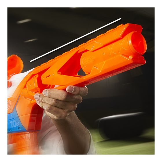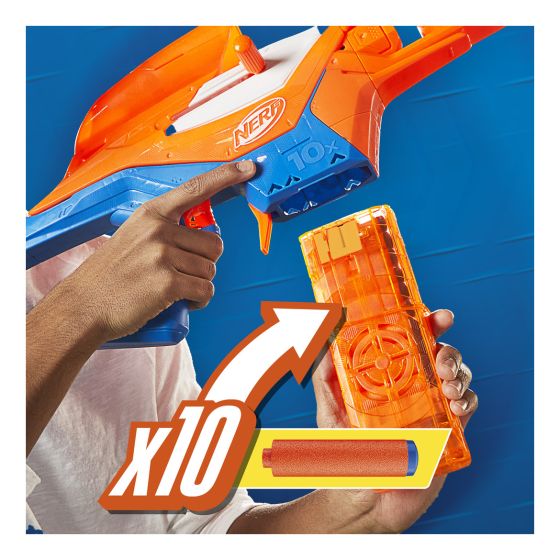 The Nerf N Series Pinpoint dart blaster is built for accuracy with cool styling and features that give you a targeting advantage in Nerf backyard games. The bolt-action blaster has a 10-dart clip and includes 18 Nerf N1 foam darts, giving you enough darts to load the clip fully and additional darts for reloads. To play, load darts into the clip, load the clip into the blaster, move the priming bolt backward and forward, and pull the trigger to fire a dart. Nerf N Series blasters are compatible only with Nerf N1 darts. Eyewear recommended (not included). NERF and HASBRO and all related trademarks and logos are trademarks of Hasbro, Inc Ages 8 and up. TO AVOID EYE INJURY: