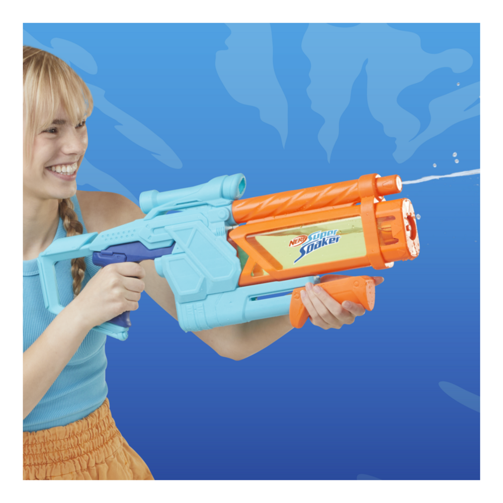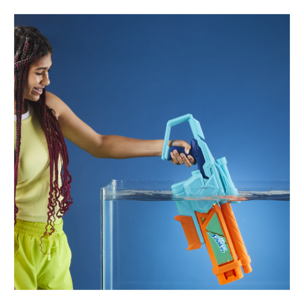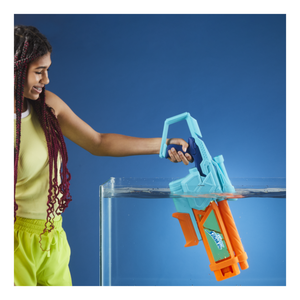 The Nerf Super Soaker Mega Dunk-Fill water blaster features an easy instant fill tank so you’re ready for water-drenching fun in no time! The innovative tank design fills super fast -- just dunk and go! There’s nothing for you to do, just submerge the tank in water and watch as it instantly refills. The translucent tank has a capacity of up to 33.9 fluid ounces (1005 ml). Dunk the tank into water and you’re ready for outdoor water games in an instant. Pump the handle back and forth to unleash a soaking blast. The blaster features a scope for targeting. Nerf Super Soaker blasters are great kids outdoor water toys and make awesome gifts to get everyone outside for fun, active play that’s a real splash!