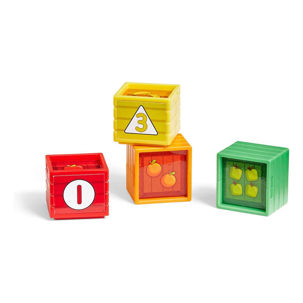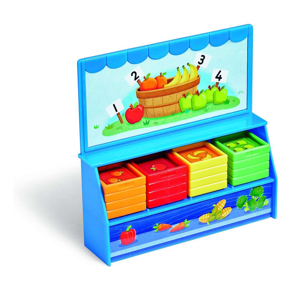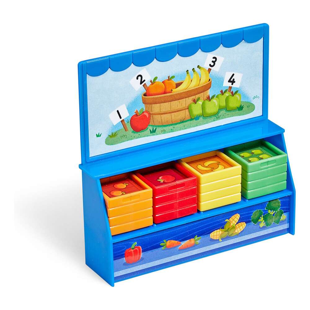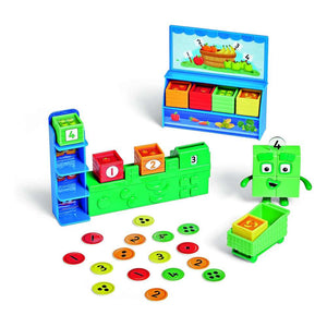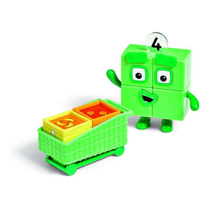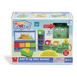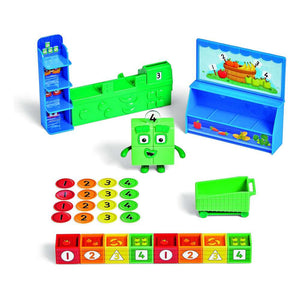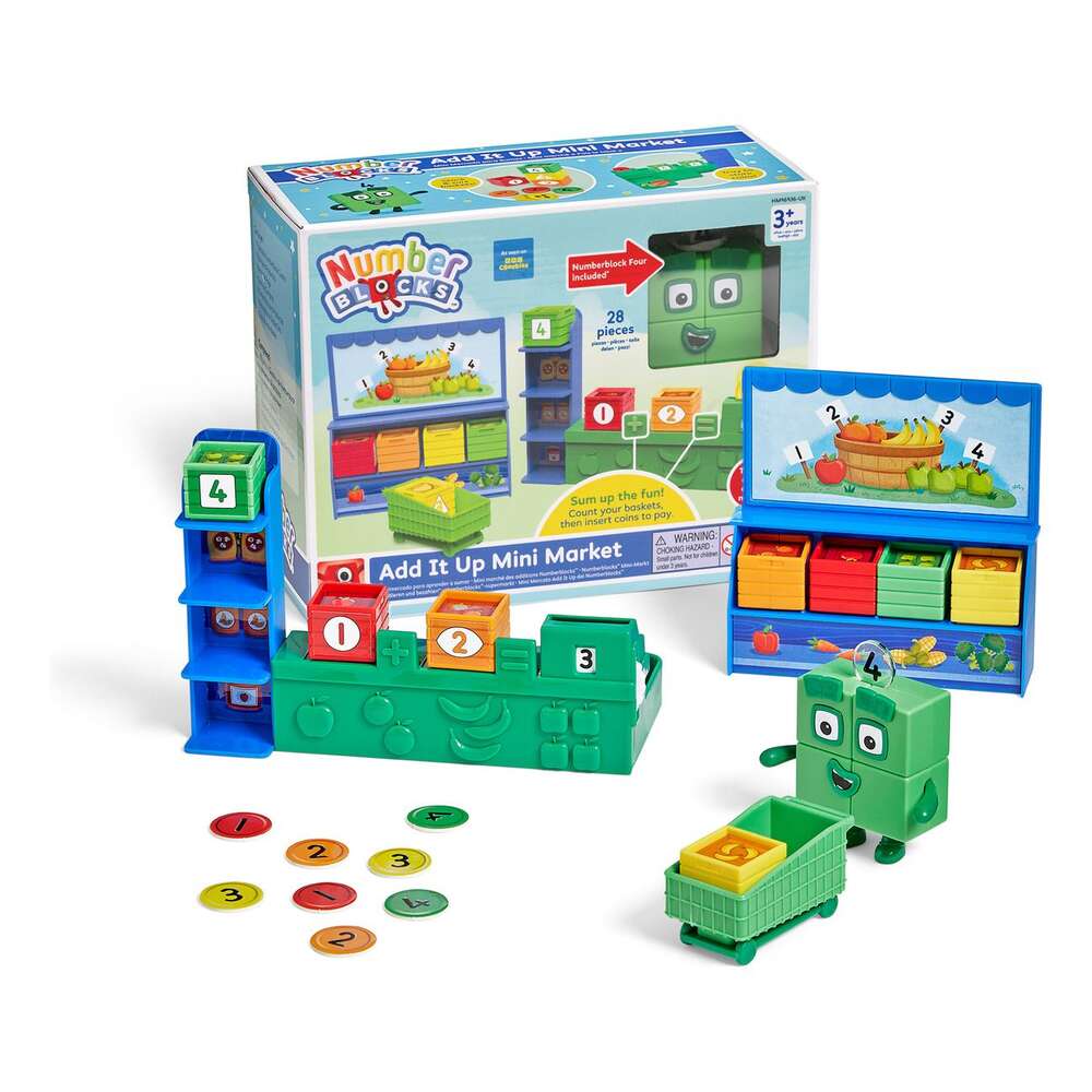 Let’s go on a shopping adventure in Numberland! Numberblock Four is the friendly shopkeeper ready to teach children about addition and maths with money. Grab the baskets of snacks and place them in the shopping trolley. When you’re ready to pay, place your baskets on the checkout counter. Add up the numbers on the baskets to see how much you need to pay, and then place your coins in the till. There are numbery features at every turn to reinforce early years maths principles through fun, purposeful play. Includes Numberblock Four Figure, produce stand, checkout counter, shopping cart, 8 produce baskets, 16 double-sided coins. The Activity Guide and packaging are multilingual. 28 Piece Set SMALL PARTS. Not for <3 yrs