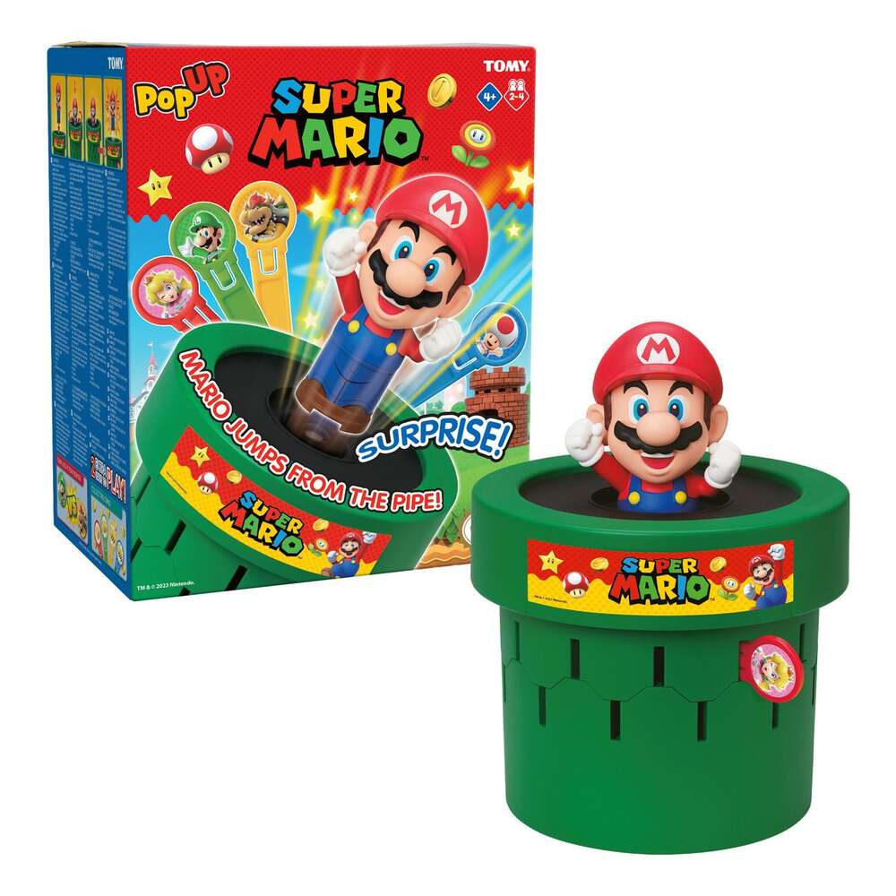 Join everyone’s favorite character in this exciting spin on a classic kid’s game from TOMY: Pop Up Super Mario™! With three ways to play, there’s plenty of fun for everyone. In Classic play, Mario is in his pipe and you have to help him get out. Each player takes turns sliding paddles into the pipe. When the correct slot is picked…POP! Mario will bounce out of the pipe and that player wins the game. Nobody knows which slot will make him pop up next – it’s different every time! For a longer game, try Coin Collection. In this version, the paddles are mixed up and placed coin side down. Each player chooses a new paddle at the start of their turn. The player that helps Mario pop out counts the number of coins on that paddle and gets that added to their score. Keep playing. Each paddle has a different number of coins, and the player with the most coins at the end wins! Team play is perfect for larger groups with Team Luigi playing against Team Bowser. The team that helps Mario pop out of the pipe wins that round. You can choose to play as a Team using either the Classic or Coin Collection version of the game. No matter which way you play, Super Mario fans both young and old will love this kid’s action game that’s easy to set up and easy to learn, but always keeps you guessing. Contains 1 Mario figure, 1 pipe, 24 colorful paddles, and easy instructions. The Pop-Up family of board games are suitable for 2-4 players ages 4 years and up.