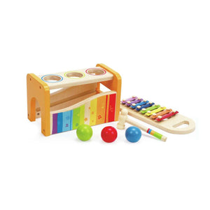 Pounding sends the balls tinkling over the xylophone. Pull out the keyboard and the xylophone can be played solo.
