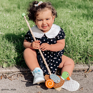 Balance and movement are at the forefront of this colourful Duck Push Along Toy. Watch as your little one pushes it across the floor, holding the easy to grip handle. As your tot pushes and pulls the wooden duck toy on wheels around, its feet will flap on the floor providing entertainment for all! The sturdy wooden pole helps to encourage mobility, balance skills and an understanding of cause and effect.