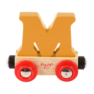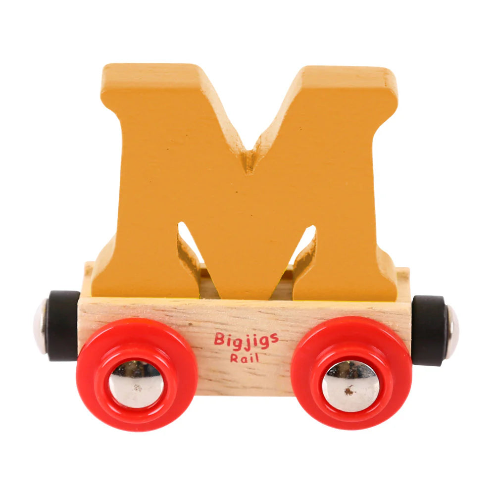 Bigjigs Rail Name carriages are loaded with a brightly coloured wooden letter or number. Each letter or number is removable and can be interchanged with other wagons and carriages in your wooden train set.