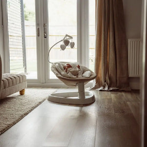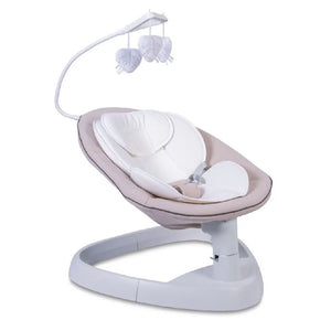 The Red Kite Sway Swing - Natural is a calming baby swing that offers a gentle side-to-side swaying motion, soothing music, and a comfortable padded seat with head support.