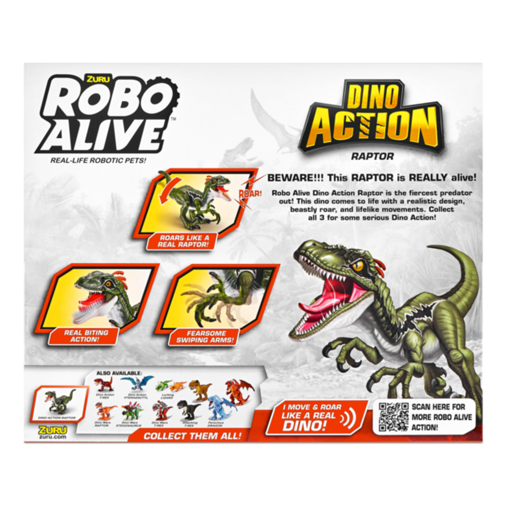 WATCH OUT, the Robo Alive Dino Action Raptor is on the loose! Watch as this Dino moves and roars just like a real Dinosaur! Trigger the tail to watch the dynamic dino arms claw out at prey and viscious jaw open to release a ROAR-some dino sound that will shake you to your bones! But don’t go too close, or risk becoming the Dino’s next hunt! This Raptor is nothing like you’ve seen before. There’s 3 diabolical dinos on the loose ready to attack! Will you tame the raging Raptor, terrorising T-Rex, or terrifying Pterodactyl? It’s more than alive- It’s Robo Alive!