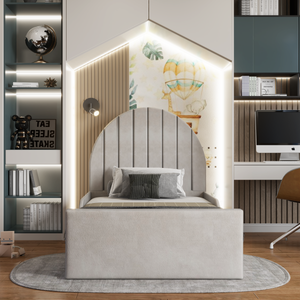 The Serene Curved Kids Bed combines elegance, comfort, and durability, featuring a stylish curved, lined headboard and reinforced timber frame. Crafted from premium, child-friendly materials, it is built to last and withstand the rigours of childhood. Available in a range of fabrics and colours, with an optional ottoman base for extra storage, this bed fits all UK standard mattress sizes. Manufactured in the UK to high-quality standards, it offers safety, style, and lasting comfort for your child’s bedroom. Its wide slats provide excellent support for mattresses, promoting healthy spinal alignment while your child sleeps. Rounded edges and optional safety side rails ensure peace of mind for parents. Easy to assemble, this bed makes creating a cozy and stylish bedroom a simple task.