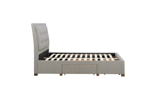 Upholstered in a beautiful soft grey fabric, this low-based bed features a detailed deep-buttoned headboard.
