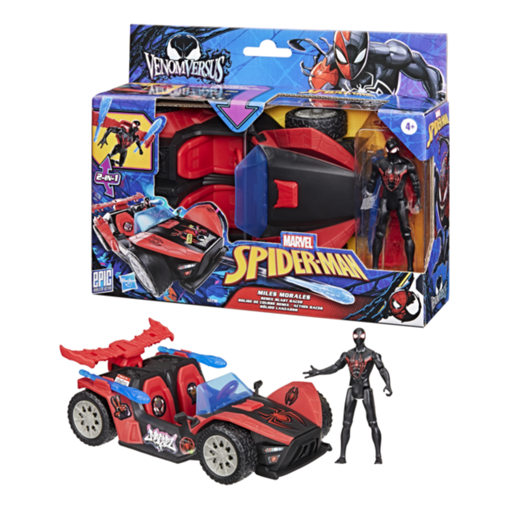 Imagine speeding into web-blasting action and adventure with the Marvel Spider-Man VenomVersus Miles Morales Remix Racer! The 4-inch-scale (10 cm) Miles Morales and vehicle toys are part of Hasbro’s exclusive Epic World of Action Series. Action figure features classic red-and-black suit design, as well as poseable limbs. Vehicle seats 2 Epic World of Series figures and comes with 3 web projectile accessories. The Remix Racer can't be missed and will be the perfect gift for kids or a great addition to any Marvel Super Hero toy collection. It even comes with an awesome sticker sheet kids can use to decorate their racer! Look for more Marvel toys to collect or gives as gifts for birthday and holidays, including figures, toy vehicles, playsets, & roleplay gear! (Each sold separately. Subject to availability.) Copyright MARVEL. All trademarks and registered trademarks are the property of their respective owners. HASBRO and all related trademarks and logos are trademarks of Hasbro, Inc.