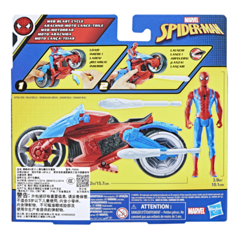 Children aged 4 and up will love imagining Spider-Man zipping through the streets while taking down the bad guys with this Marvel Spider-Man Web Blast Cycle! Children can step into the world of Spider-Man for amazing web-slinging action and adventures. This Spider-Man playset includes a 10-cm-scale action figure, a toy motorcycle, and two web blast projectiles so children can sling imaginary webs and become a hero. With multiple points of articulation, children can pose the figure and imagine themselves in battle. This toy vehicle playset has everything children need for pretend superhero play inspired by the Marvel Universe! Copyright 2022 MARVEL. Hasbro and all related terms are trademarks of Hasbro.