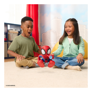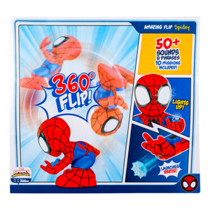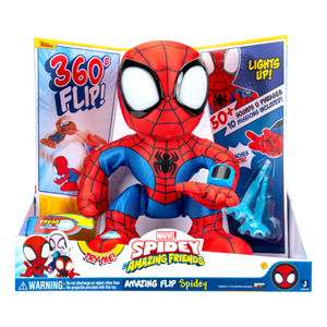 Bring home the action and fun of Spidey and His Amazing Friends with the Amazing Flip Spidey Plush! This soft and cuddly superhero is full of energy, performing cool flips with just a press or toss. Kids can enjoy both a snuggly companion and an action-packed toy all in one. With his bright red and blue suit and friendly expression, Spidey is always ready to save the day—or join in for bedtime cuddles. Perfect for little fans who love adventure and plush play.