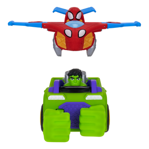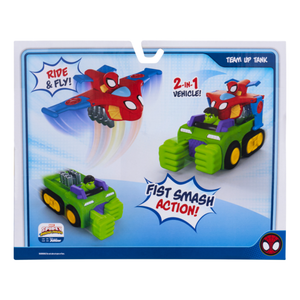 Glide, smash, and join forces with the MARVEL Spidey and His Amazing Friends Team Up Tank. Featuring two unique vehicles including Spidey and Hulk, this heroic duo can join forces to stop baddies everywhere. First, roll out the 6-inch Hulk Smash Tank and push it forward to make its fists punch. Then, fly in the 4-inch Spidey Glider Jet, land on top of the Hulk Smash Tank, and its wings will fold down to join into one vehicle. When it’s time to split up, launch the Spidey Glider Jet and its wings will pop back up on their own. The MARVEL Team Up Tank is inspired by the hit show Spidey and His Amazing Friends. Officially licensed MARVEL product from Jazwares. Ages 3+