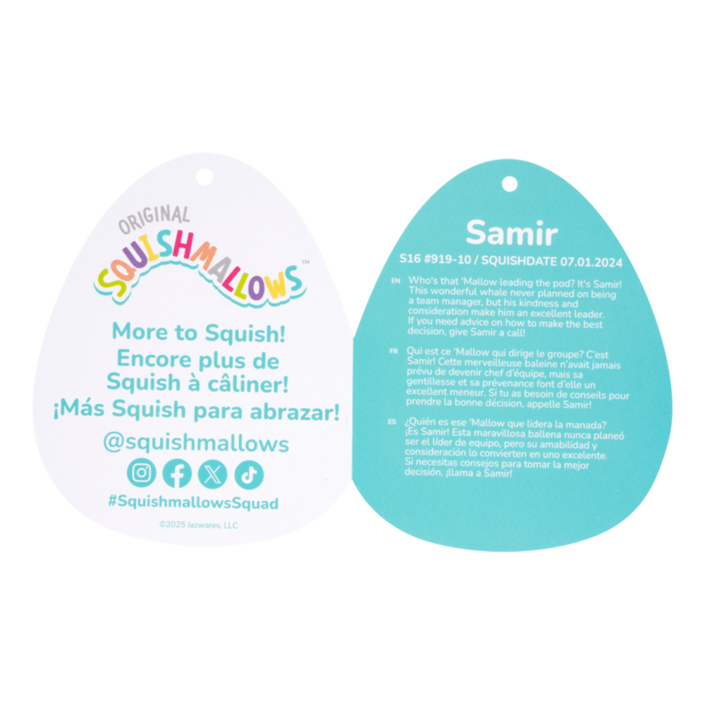 Each Squishmallows comes with a unique name and bio. Samir is a whale of a leader! Official Squishmallows product: look for the official seal and join the Squad! Squishmallows are made with ultrasoft, high-quality material.