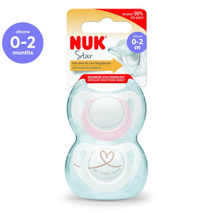NUK Star Newborn Baby Soother, 0-2 Months. Isn’t it great when there’s something you can always rely on? The NUK Star soother is just that. 99% of babies are soothed by it*. 96% of breastfeeding mothers appreciate that it’s breastfeeding-friendly*. And more than 90% of orthodontists recommend it because of its jaw-friendly shape.* Unfortunately, babies can’t explain why they love their NUK Star so much. But we suspect it’s because of the pleasant feeling in their mouths: the special soft zone on the upper side nestles very gently against the palate, while the underside of the NUK Star leaves room for the tongue’s natural sucking movements. And because it’s very narrow and flat, hardly any pressure is exerted on the teeth or jaws.