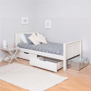 The Stompa Classic Single Bed With Pair Of Drawers in White is a versatile single bed perfect for use in a childs room or a guest room. This bed is a beautifully crafted bed made from solid pine with attractive tongue and groove details on the footboard and headboard for a stylish finish. The storage drawers fit neatly under the bed with castors for easy accessibility. The Stompa Classic Single Bed With Pair Of Drawers in White is great for all ages