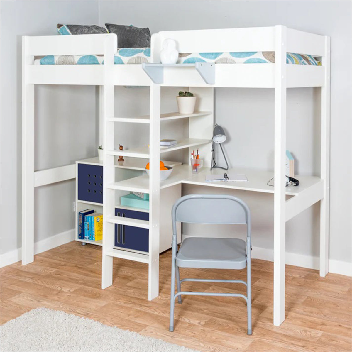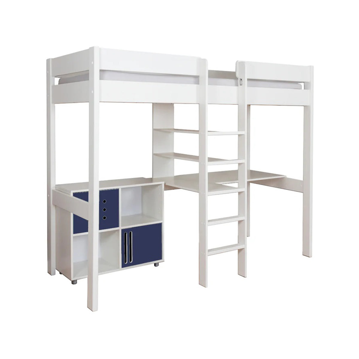 - Features Highsleeper bed with integrated desk and shelving system and 2 Cube Units with 4 navy blue doors