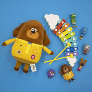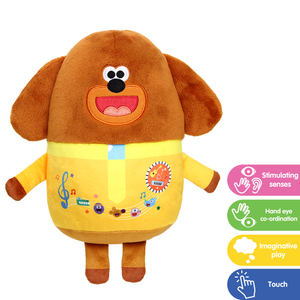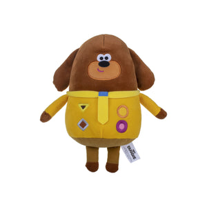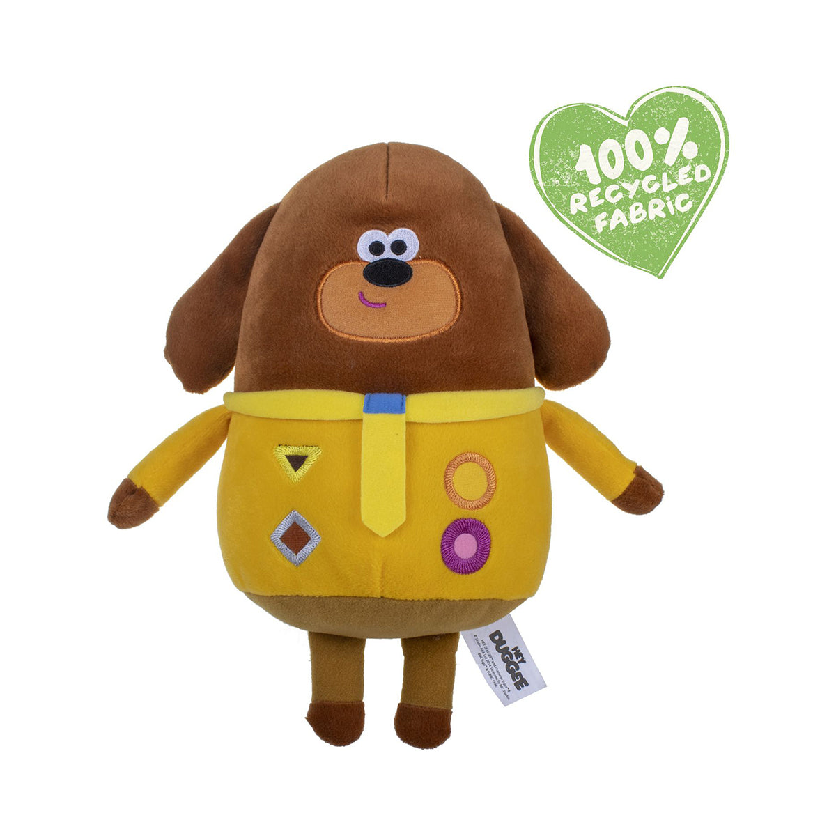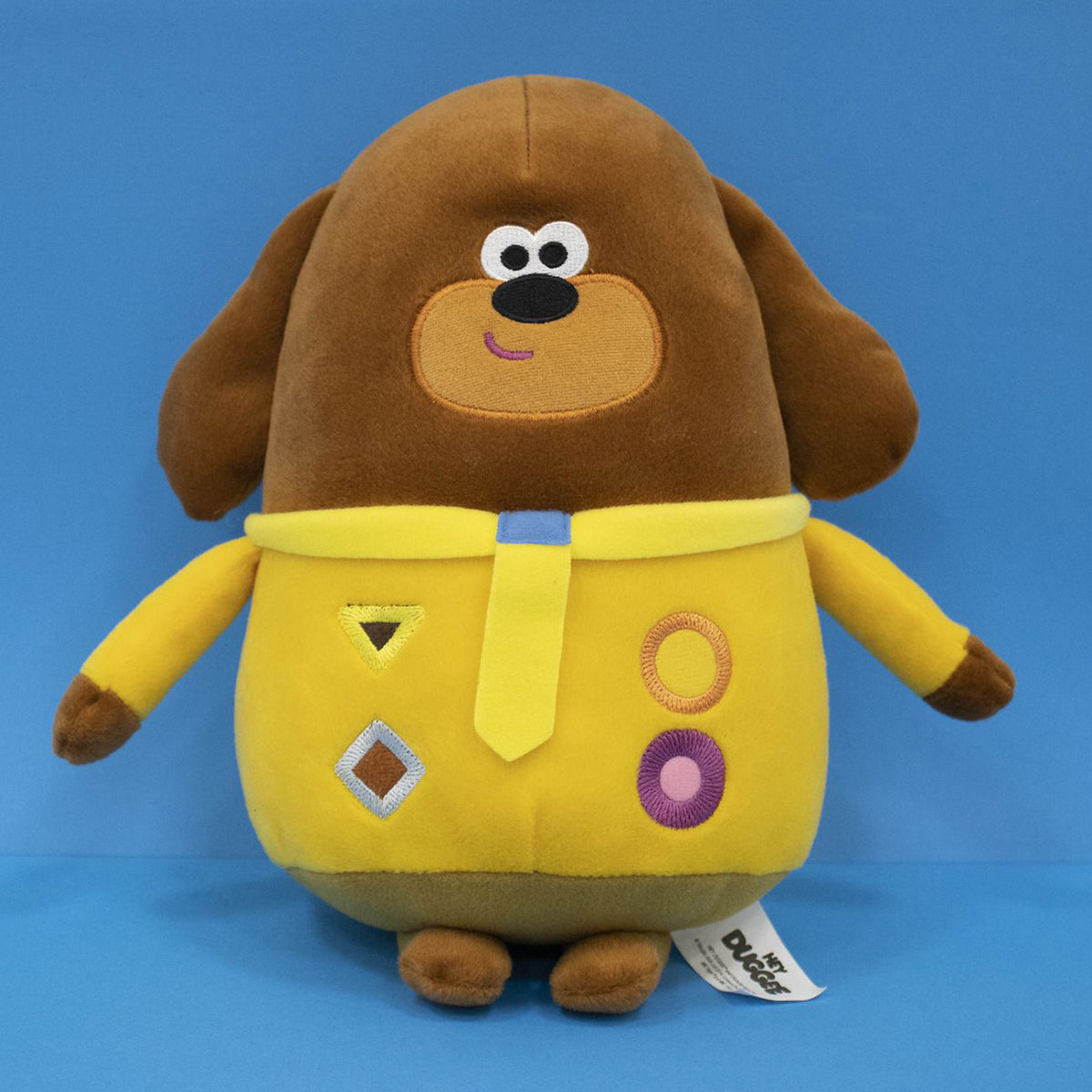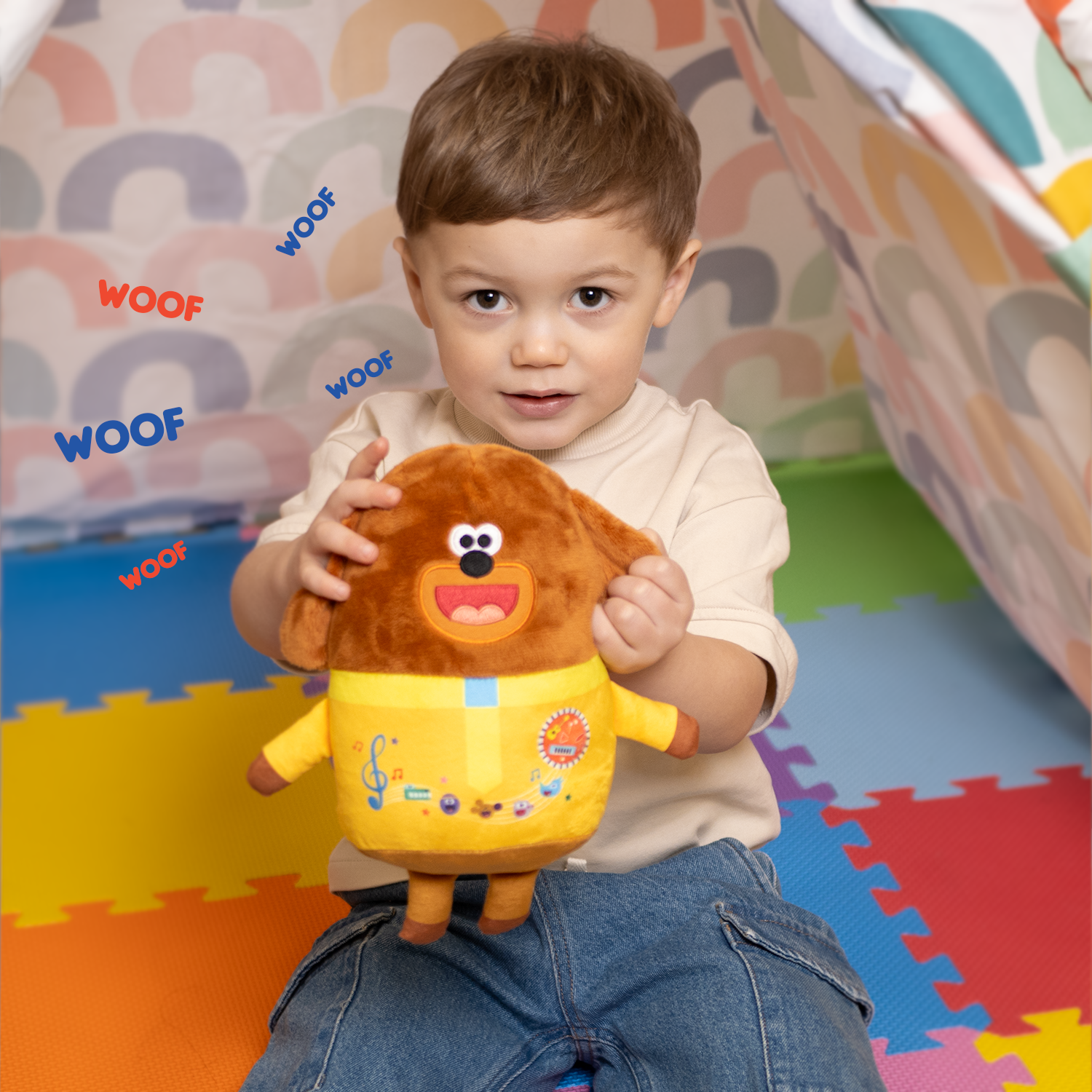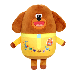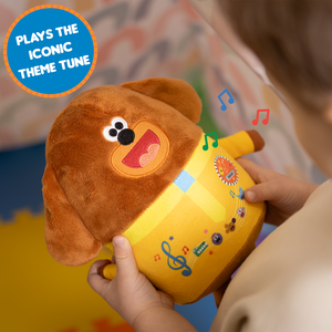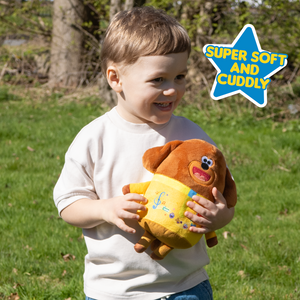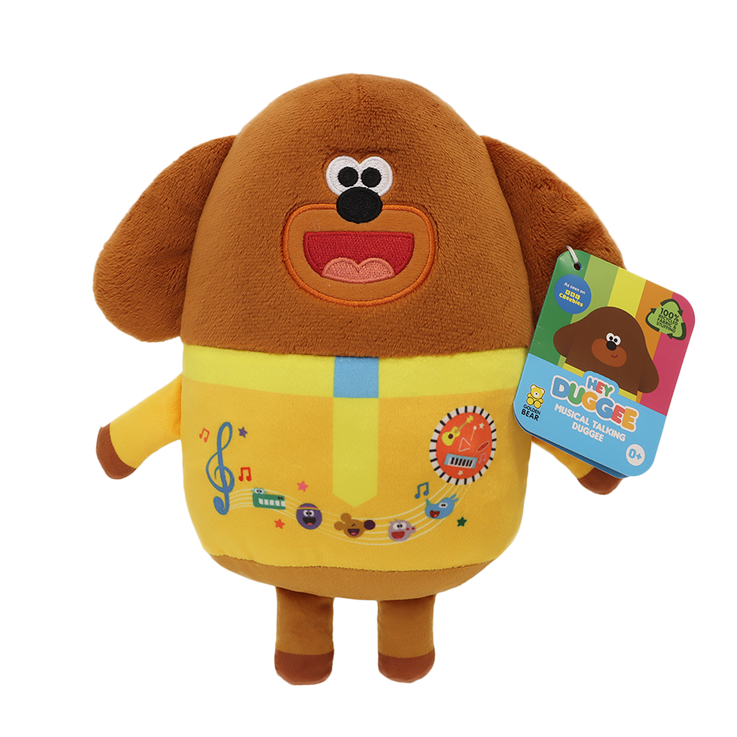 Get ready for a Duggee hug! This big lovable dog is super-soft and huggable making him the perfect cuddle companion for all Hey Duggee fans. Musical Talking Duggee is great for playtime too! Press his musical notes badge to listen to the iconic theme tune from the hit kids TV show – little ones will love to dance along! He also Woofs just like in the show! Made from the soft fabrics with embroidered detailing. Little ones can take Musical Talking Duggee on all their adventures or cuddle up for show-time and story time. Suitable for all ages. Approx. 25cm high.