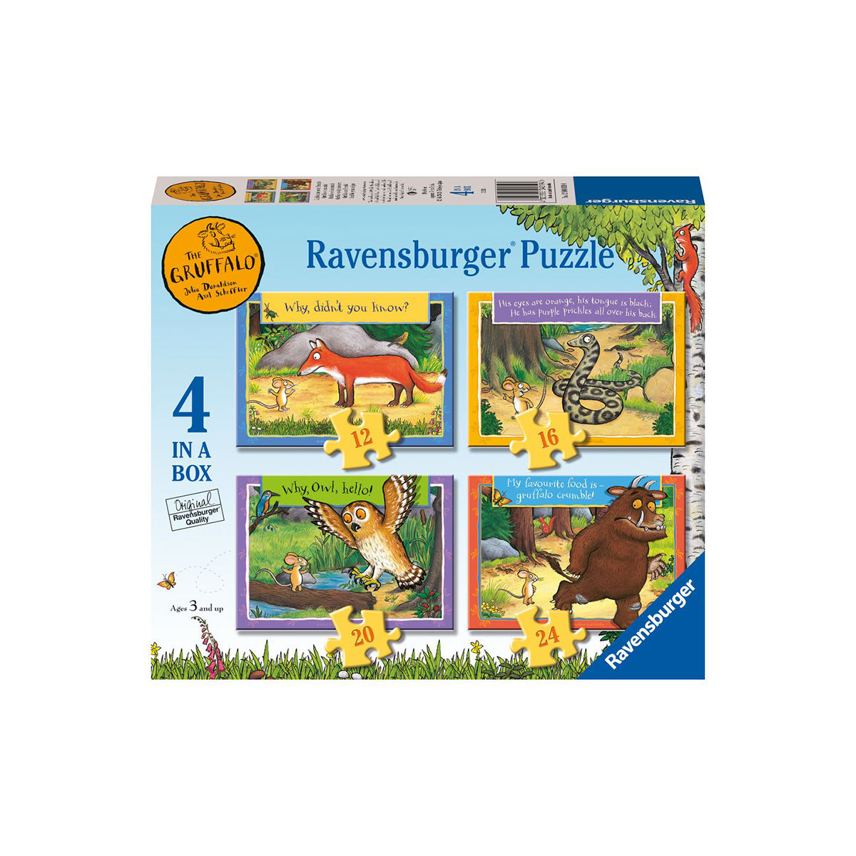 Join Gruffalo, Snake, Fox, Owl and Mouse in this bright and colourful 4 in a box puzzle set, as we hear part of the iconic Gruffalo story from the adorable Mouse's point of view! This 4 in a box is an absolute must have for any Gruffalo fan.