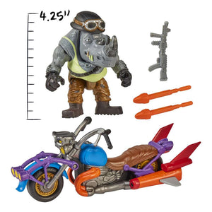 Get ready for the Mutant Mayhem figures and vehicles, based on the new CG animated Teenage Mutant Ninja Turtles movie! When Superfly unleashes Mutant Mayhem in New York City, Rocksteady joins the fight on his Chopper Cycle! The cycle speeds down the city streets and Rocksteady launches into action! As the opponent approaches, Rocksteady presses the fin on the side of his Chopper Cycle to launch twin missiles in their direction. The baddie is quickly knocked down and knocked out!