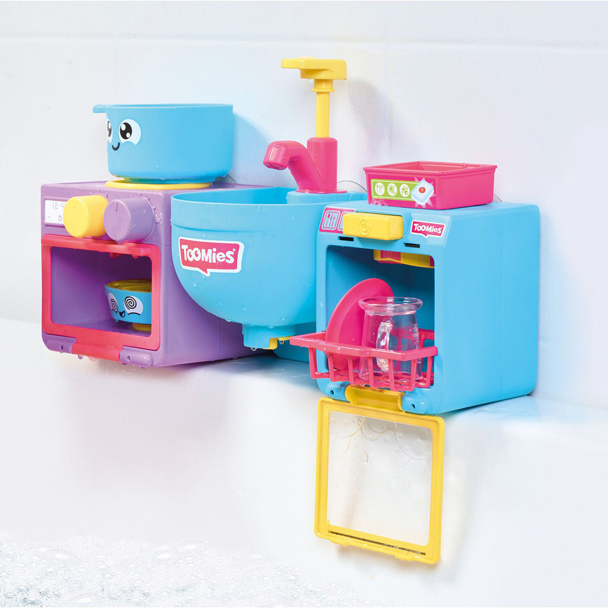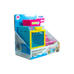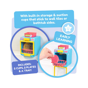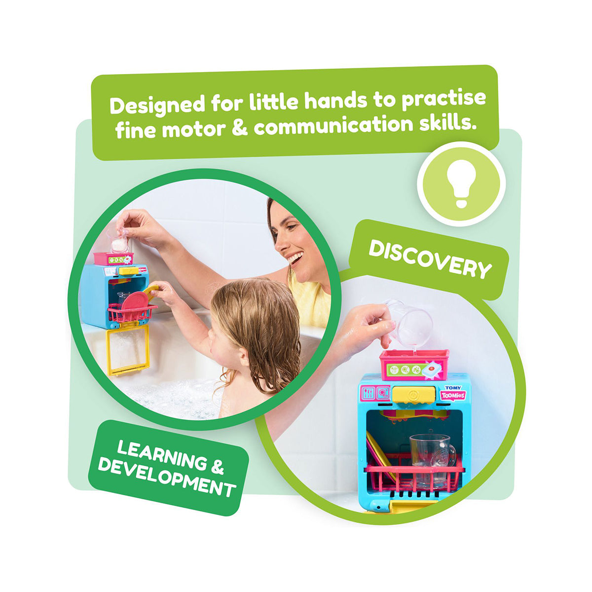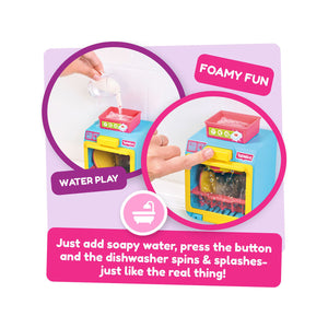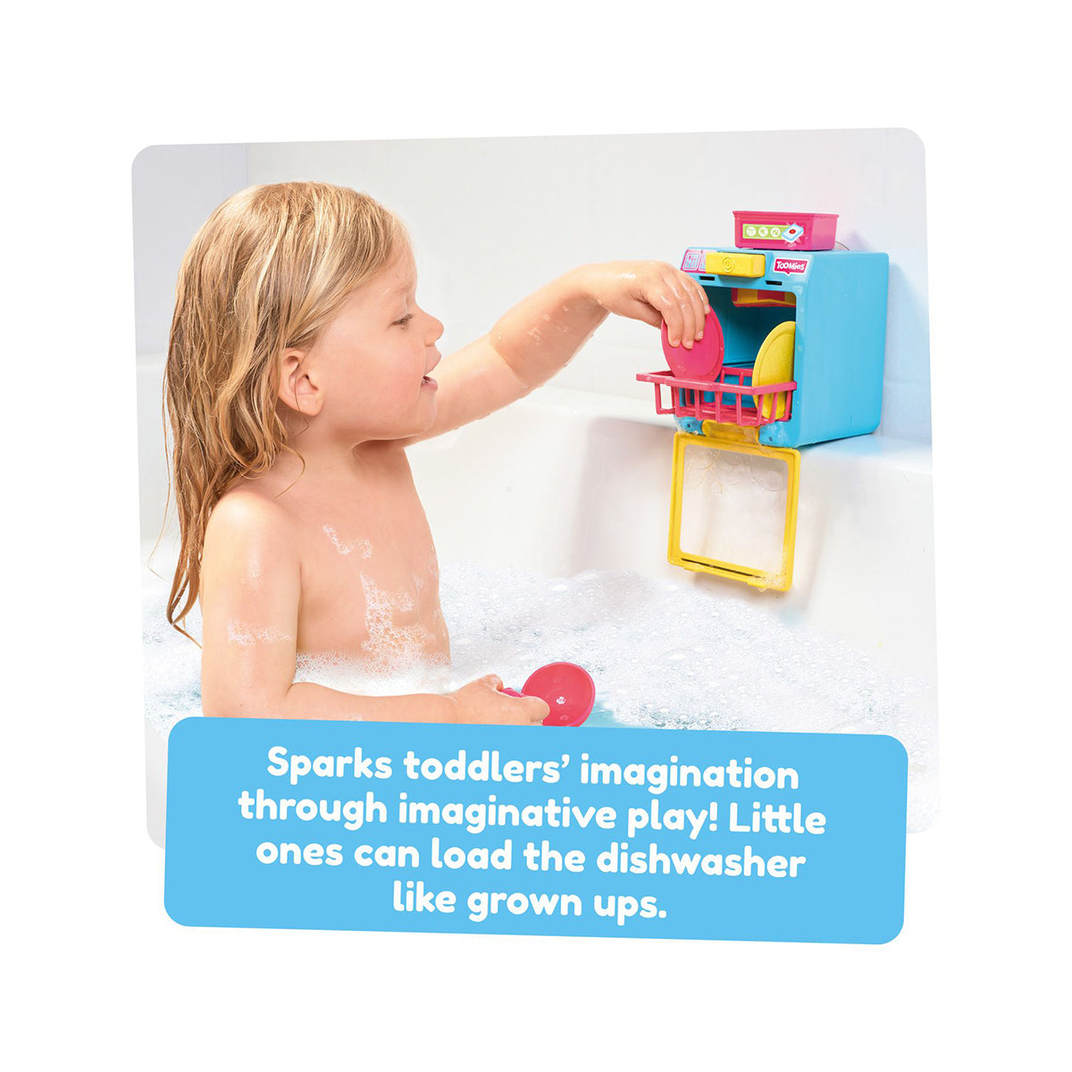 This toy turns bath time into a pretend dishwashing adventure for toddlers. Kids can load up the toy dishwasher with its own plates and cups, add water at the top, press a button and watch as a sprayer spins and splashes. It attaches securely to smooth bath or tile surfaces with suction pads. The set includes cups, plates and a rack to encourage role play, fine motor development, and cause‐and‐effect learning. Easy to clean by draining, rinsing and air drying.