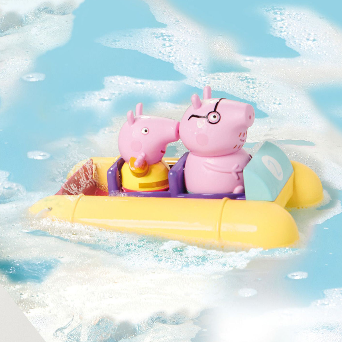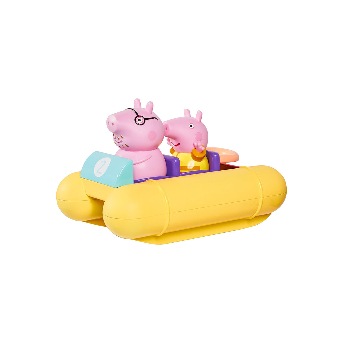 - Peppa Pig and Daddy Pig ride a yellow pedalo.