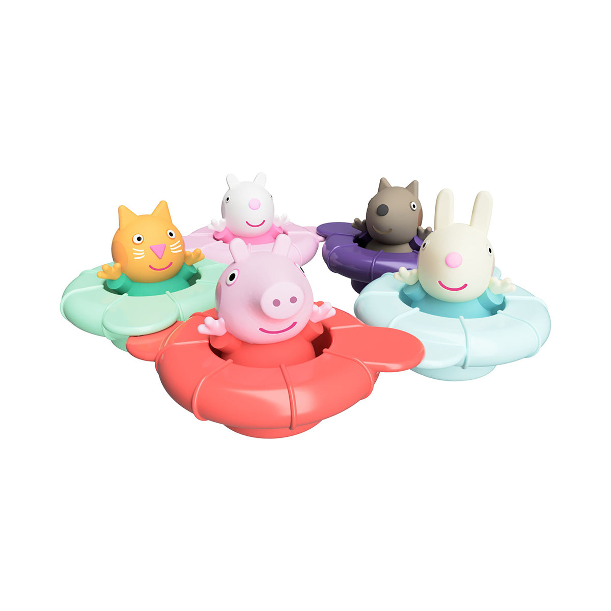 Each pouring ring doubles as a water sprinkler, producing different patterns as kids shower the water through the base or over the curvy sides. Rings also link up thanks to clever tabs on the side that interlock easily to join two or more rings side by side. Connect all five to form a giant ring! Peppa and her friends all drop easily into any ring, so little ones can mix them up or play a colour matching game: their swimsuits coordinate with the colour of the floating rings!