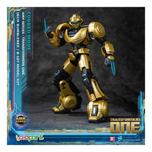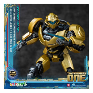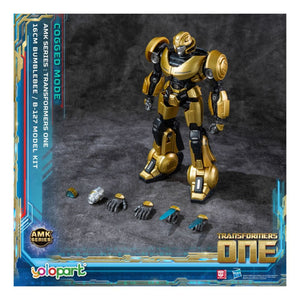 This is an officially licensed model kit / collectible figure of B-127 (Bumblebee) in Cog-less Mode from the Transformers ONE movie. It stands about 12.5 cm (≈ 5 inches) tall. The kit is mostly pre-assembled or has simple assembly (attaching parts like head, limbs, accessories) and comes with detailed paintwork. It has about 15 points of articulation so you can pose it in different ways. It includes accessories like a Cog of Conversion, a tool helmet, a jet pack, and multiple interchangeable hands.