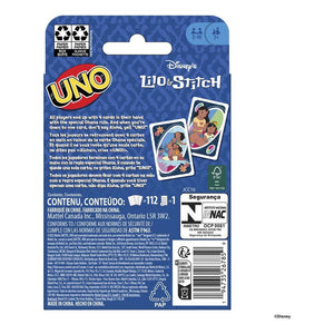 Fans of Disney's Lilo and Stitch will love playing with this themed UNO card game. With a deck featuring graphics inspired by favourite characters and scenes, players try to match colours and numbers -- there's even a special 'Ohana' rule that ends up with all players having four cards in their hand! And when down to a last card, don't forget to yell 'UNO!' Makes a great gift for fans of Disney's Lilo and Stitch and card game lovers ages 7 years old and up. Colors and decorations may vary.