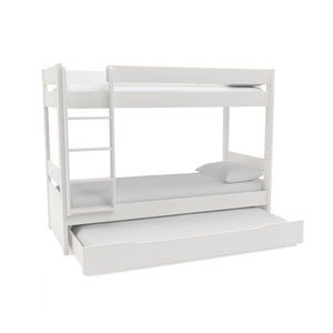 Our bestselling Uno Bunk Bed has been redesigned and has the option to add a slatted trundle drawer. The generous space between the bunks offers plenty of room to sit up and read in bed or for parents to read at bedtime. You also have the option to split the bunk into 2 single beds. A stylish solid Scandinavian pine bunk bed for sale in a sleek white finish. Home Assembly now available with extended Stompa 5 year Warranty.