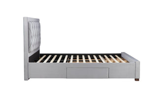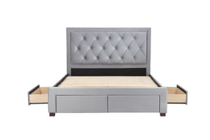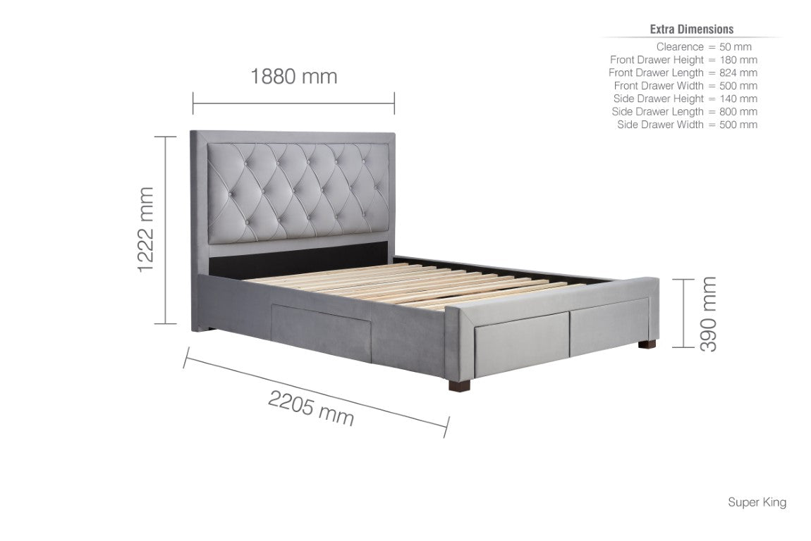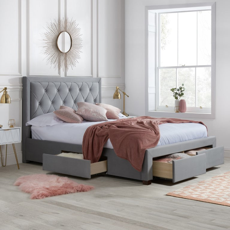 Upholstered in a grey luxurious fabric and features handy storage drawers to stowaway away your belongings.
