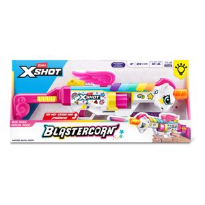 Equipped with 24 Air Pocket Technology foam darts, it delivers powerful blasts reaching up to 98 ft/30m, offering everything you'd expect and more from a Blastercorn—bigger and better than ever! Perfect for outdoor play or open spaces where you'll be able to see your darts fly through the air up to 98 feet. It's the perfect blaster for ages 8+.