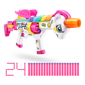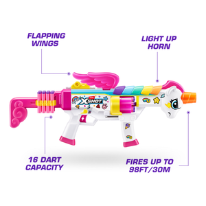 Introducing the bold and brave XSHOT Big Rizz Blaster, where fierce blaster meets whimsical unicorn to create your lastest formidable winged warrior. The Big Rizz lights up the battlefield with its illuminating horn and flapping wings bringing an explosion of color and excitement to your battles.