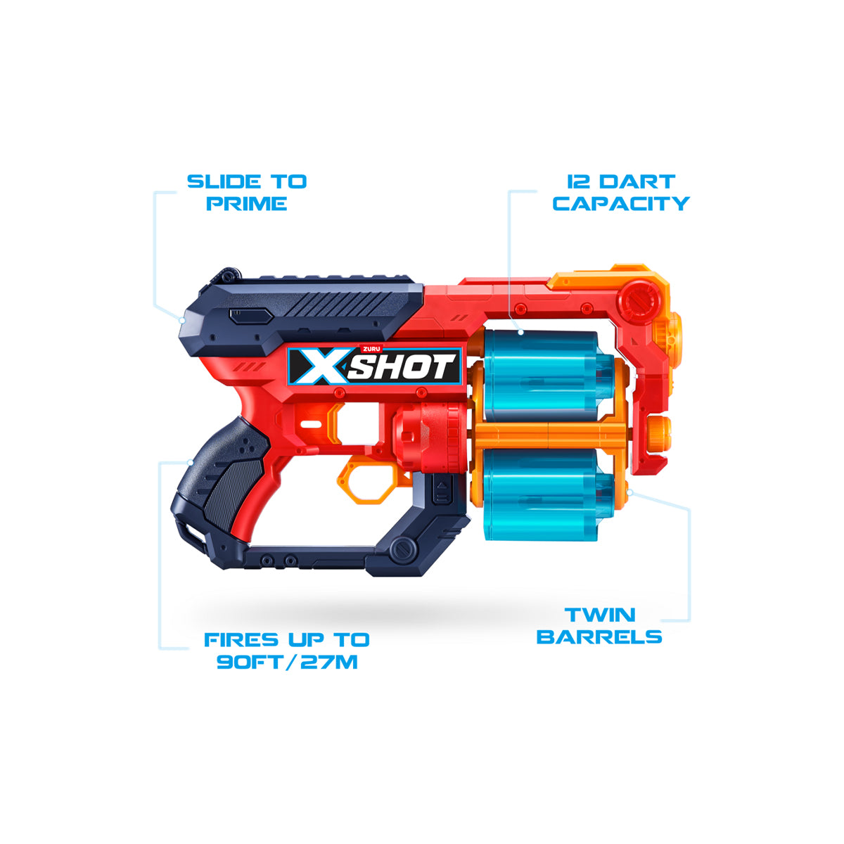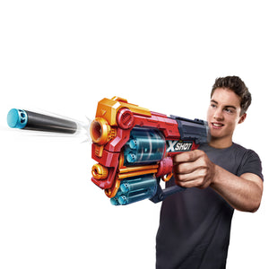 Create absolute mayhem with the X-Shot Excel Xcess! With a 12 dart capacity and double trouble rotating barrels your opponent won’t know what hit them! The Xcess can hit targets up to 27m / 90 feet away. With 2 rotating barrels for double the fun, when you run out of darts in one, simply switch over to the second barrel and blast the competition away!