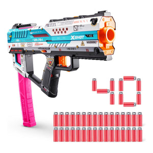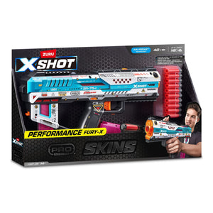 Take your dart blasting to the NEXT LEVEL with the XSHOT SKINS Pro Series Fury-X Blaster. The Fury-X is designed to achieve accuracy and distance in every blast. Equipped with a quick release 20 half dart capacity clip, your blaster battles have just gone pro! Includes 40 XSHOT Air Pocket Technology half darts for a further, faster and more stable flight. Featuring Slam Fire Action to blast through the 20 dart clip in seconds and take out targets up to 43m / 140 feet away! Go NEXT LEVEL with XSHOT Pro Series.