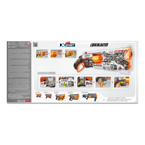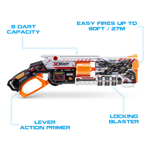 The XSHOT Skins Lock Blaster puts the power in your hands! Each Lock Blaster comes with a QR code to discover your unique lock combination. Unlock your blaster to start the fun! The Lock Blaster has a 8 dart rotating barrel to blast through darts in seconds and hit targets up to 27m / 90 feet away! When the battles over, lock your blaster and no one else will be able to use it. Choose different, choose XSHOT Skins.